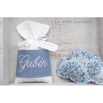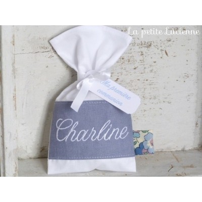 Ballotin de dragées en liberty betsy verveine. Ce joli ballotin de dragées est personnalisable avec le prénom brodé sur du lin bleu indigo. Un délicat badge en liberty Betsy verveine permet d'ouvrir et de fermer le pochon. 2 modèles vous sont proposés, le premier avec badge et ruban, le 2eme modèle est avec le badge uniquement permettant d'avoir un pochon...