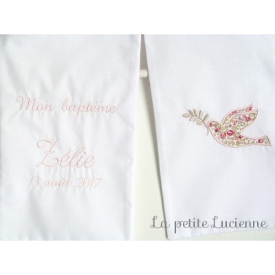 Etole de baptême en liberty Capel rose brodée Cette écharpe de baptême est délicatement brodée d'une colombe en liberty rose poudré, la comobe symbole du baptême tient une branche d'olivier. L'écharpe de baptême est personnalisée selon vos souhaits. Composition: popeline de coton blanc entièrement doublé. Nettoyage à sec recommandé. En broderie blanc...