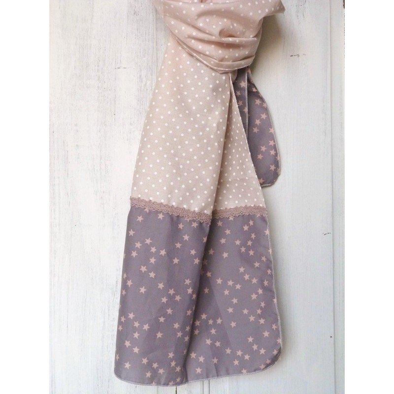 Joli chèche en voile de coton pêche à petits pois blanc, joliment décoré d'une batiste gris parsemée d'étoiles rose