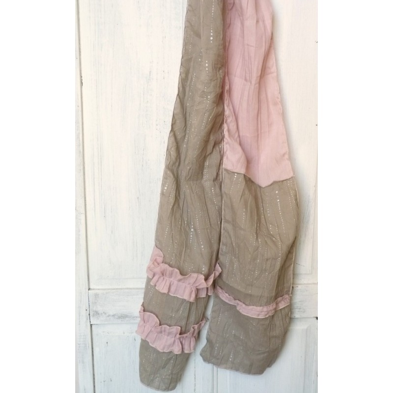 Accessoire de mode de l'année, découvrez ce joli chèche en coton froissé taupe et rose. Le coton taupe à pois argenté est joliment mis en valeur par la couleur rose pale conférant ainsi élégance et charme intemporel. dimensions du chèche Long: 200 larg:16cm
