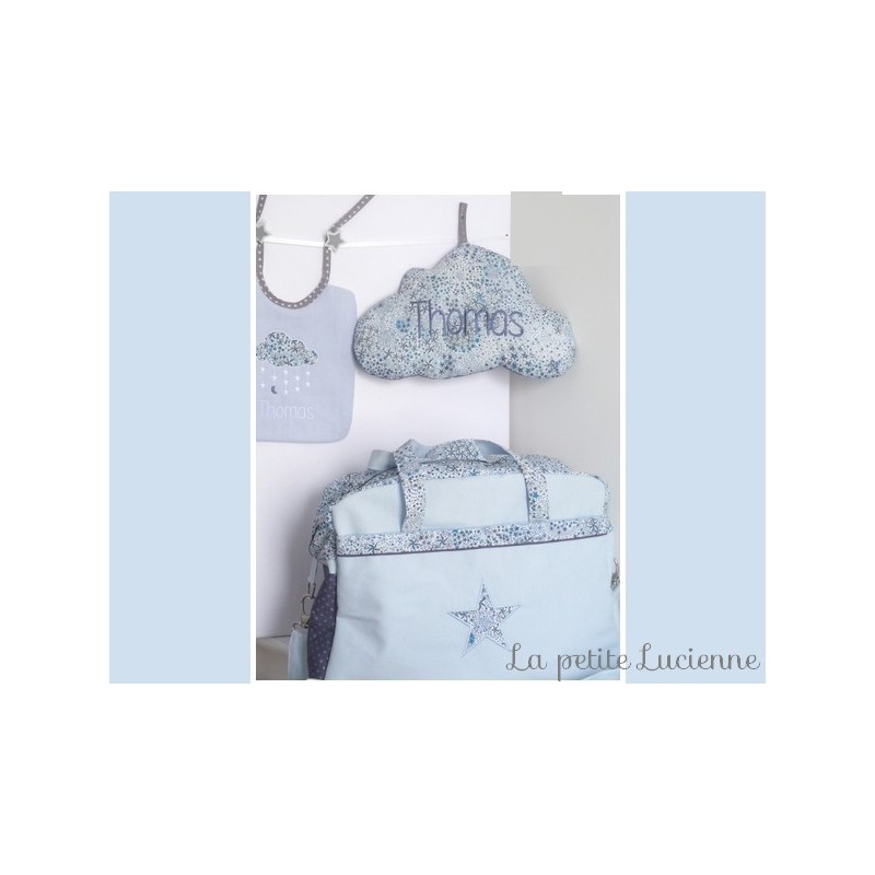 La petite Lucienne est heureuse de vous proposer ce sac à langer en liberty bleu personnalisé.