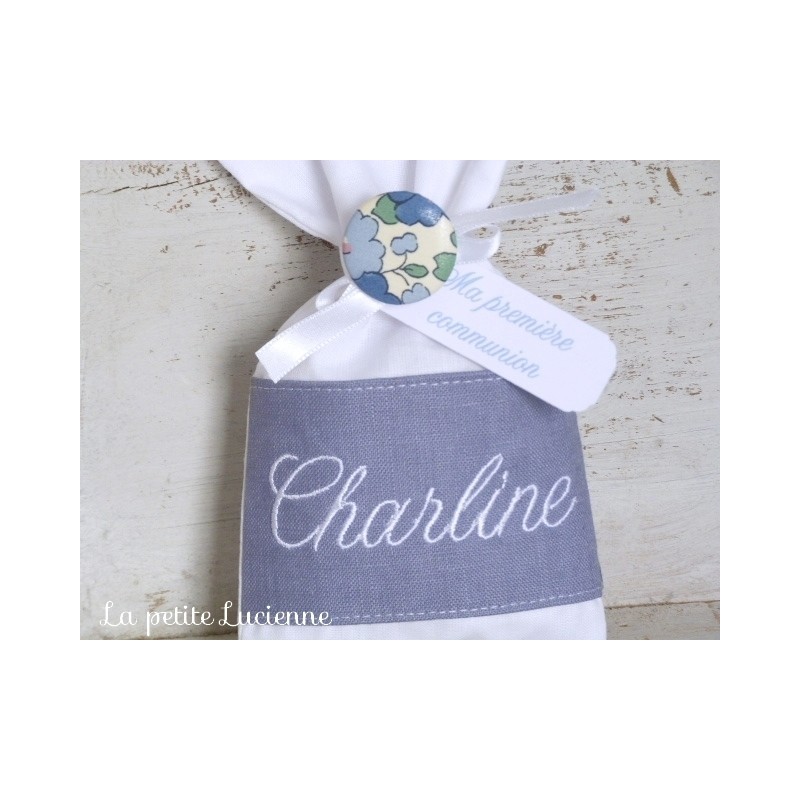 Ce joli ballotin de dragées est personnalisable avec le prénom brodé sur du lin bleu indigo. Un délicat badge en liberty Betsy verveine permet d'ouvrir et de fermer le pochon.